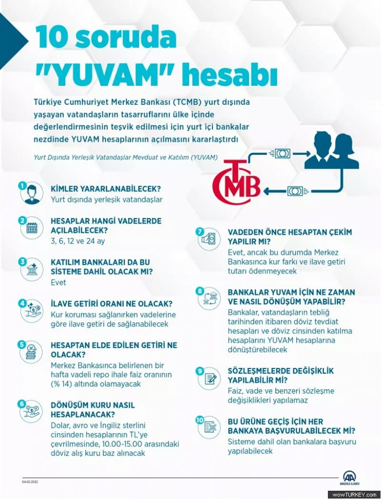 Türkiye Cumhuriyet Merkez Bankası (TCMB) yurt dışında yaşayan vatandaşların tasarruflarını ülke içinde değerlendirmesinin teşvik edilmesi için yurt içi bankalar nezdinde YUVAM hesaplarının açılmasını kararlaştırdı.