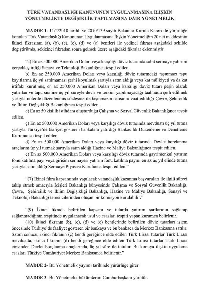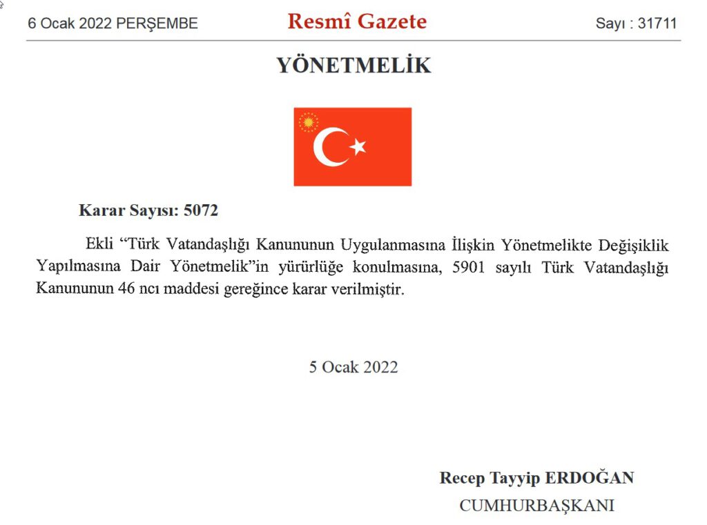 Resmî Gazete’nin bugünkü sayısında Cumhurbaşkanı Recep Tayyip Erdoğan’ın imzası ile yayınlanan, ‘Türk Vatandaşlığı Kanunun Uygulanmasına İlişkin Yönetmelikte Değişiklik Yapılmasına Dair Yönetmelik’e göre; yabancı uyruklu kişilerin Türk vatandaşlığına kabulündeki şartlarda değişikliğe gidildi.