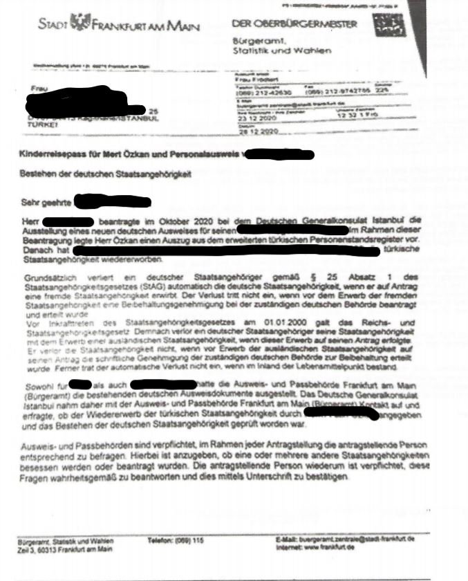Frankfurt’ta, Alman kimliğini ve pasaportunu yenilemek isteyen F.C. isimli Türk ile O.C. isimli eşinin pasaportlarına el konuldu. 1996 yılında Alman vatandaşlığını alan çifte, “O tarihteki alışveriş faturalarını, benzin faturalarını vs getirin, size inanalım” denildi.