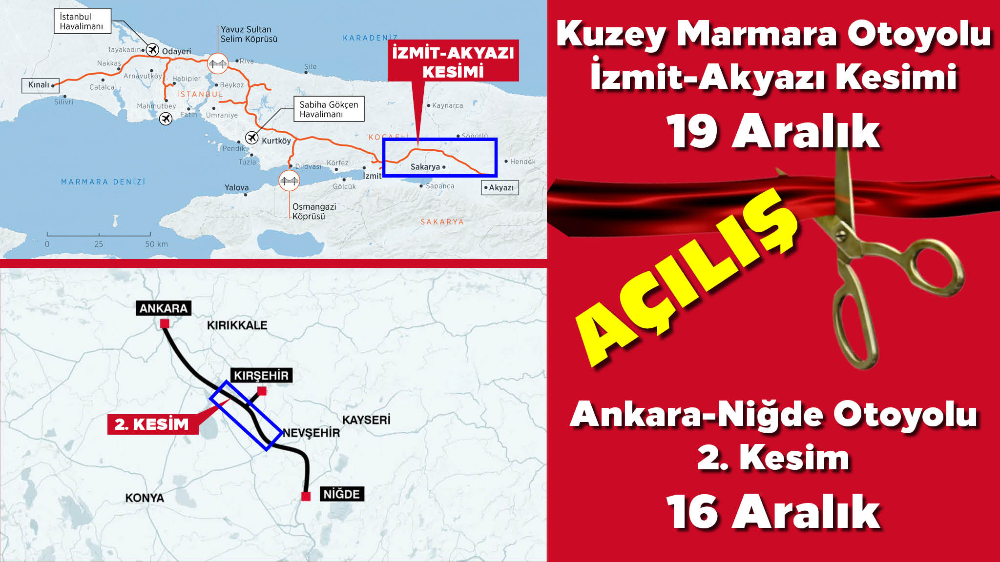 Ankara-Niğde Otoyolu 2. kesimi 16 Aralık’ta, Kuzey Marmara Otoyolu İzmit-Akyazı kesimi 19 Aralık’ta Açılıyor