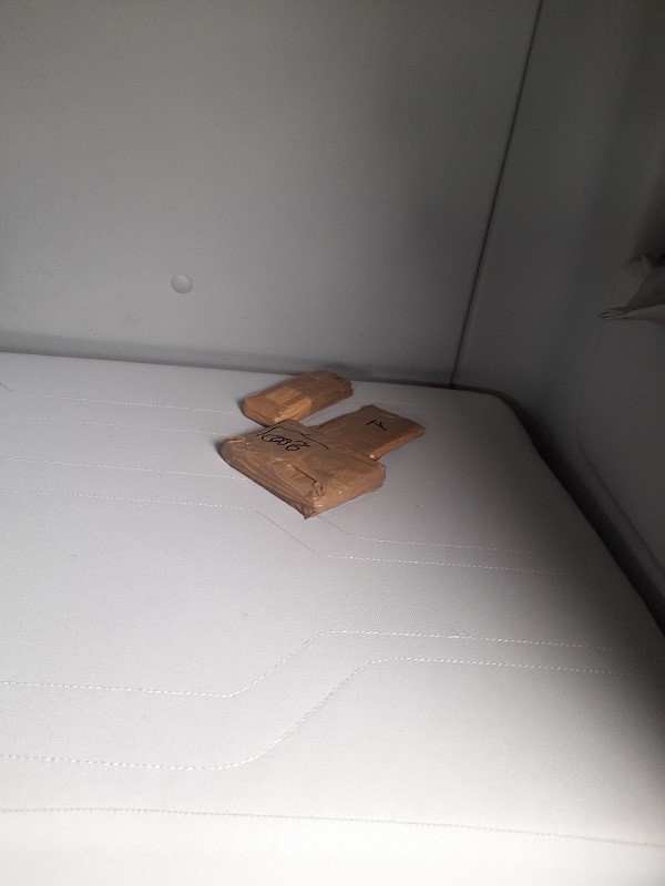 Kamyon kabininde yapılan kontrolde, gümrük görevlileri sürücü koltuğunun arkasındaki yatağa paketlenmiş bir şekilde yastığın altına bantla sarılmış üç paket buldu.