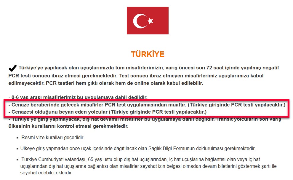 Pegasus da web sitesinden yaptığı açıklamada cenaze beraberi gelen veya cenazesi olduğunu beyan eden yolcuların PCR testi ibraz zorunluluğundan muaf olduklarını açıkladı.