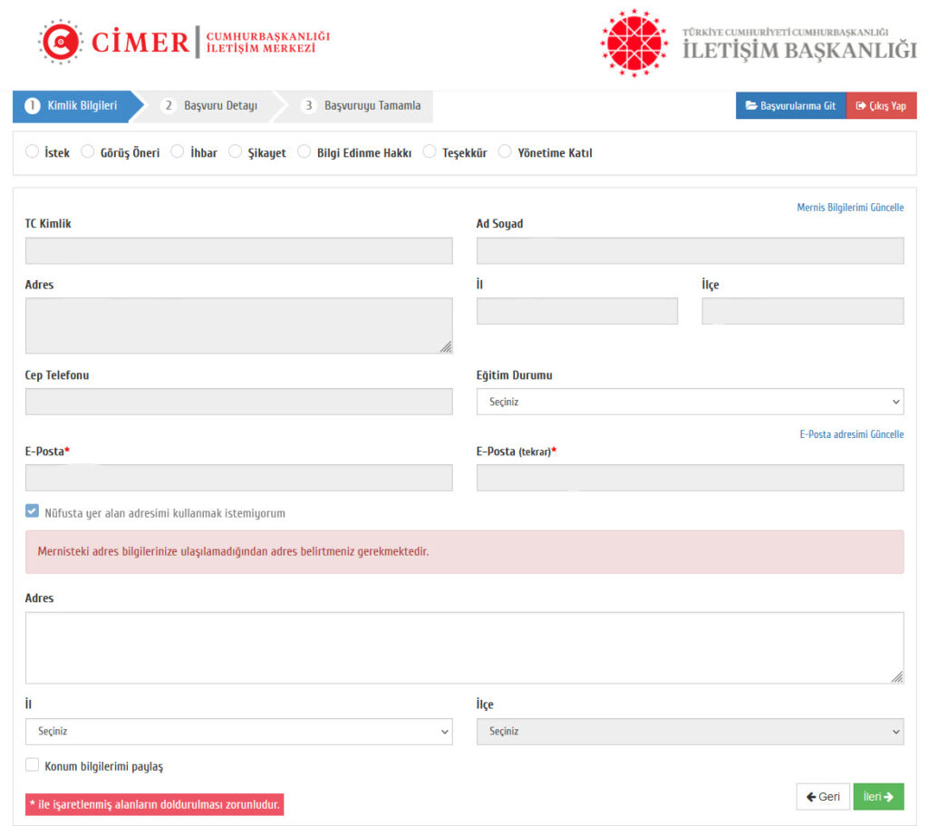 - Bu bağlamda mutlaka T.C. kimlik numarası, İsim soy isim ile beraber adres bilgileri doğru şekilde girilmelidir.