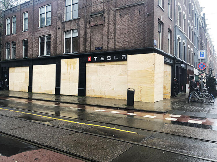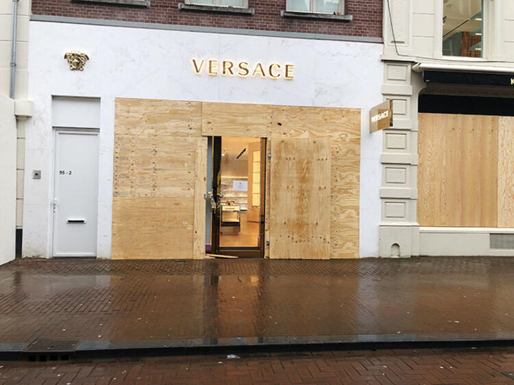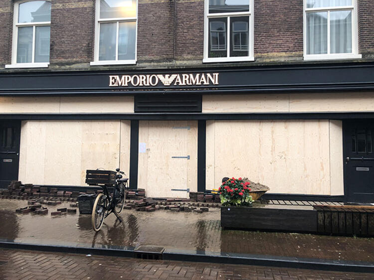 Amsterdam’da mağazalar, sokağa çıkma kısıtlamasını protesto eden göstericilerin yağmalama olaylarına karşı vitrinlerini tahta plaka ve beton bloklarla kapattı.