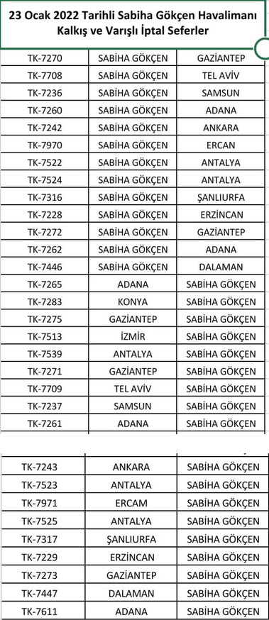Türk Hava Yolları tarafından yapılan açıklamada, “Olumsuz hava koşullarında tüm ekiplerimiz ile seyahat güvenliğiniz için çalışıyoruz. 23 Ocak tarihli, Sabiha Gökçen Havalimanı kalkışlı ve varışlı toplam 31 seferimiz tedbir amaçlı iptal edilmiştir.” denildi.