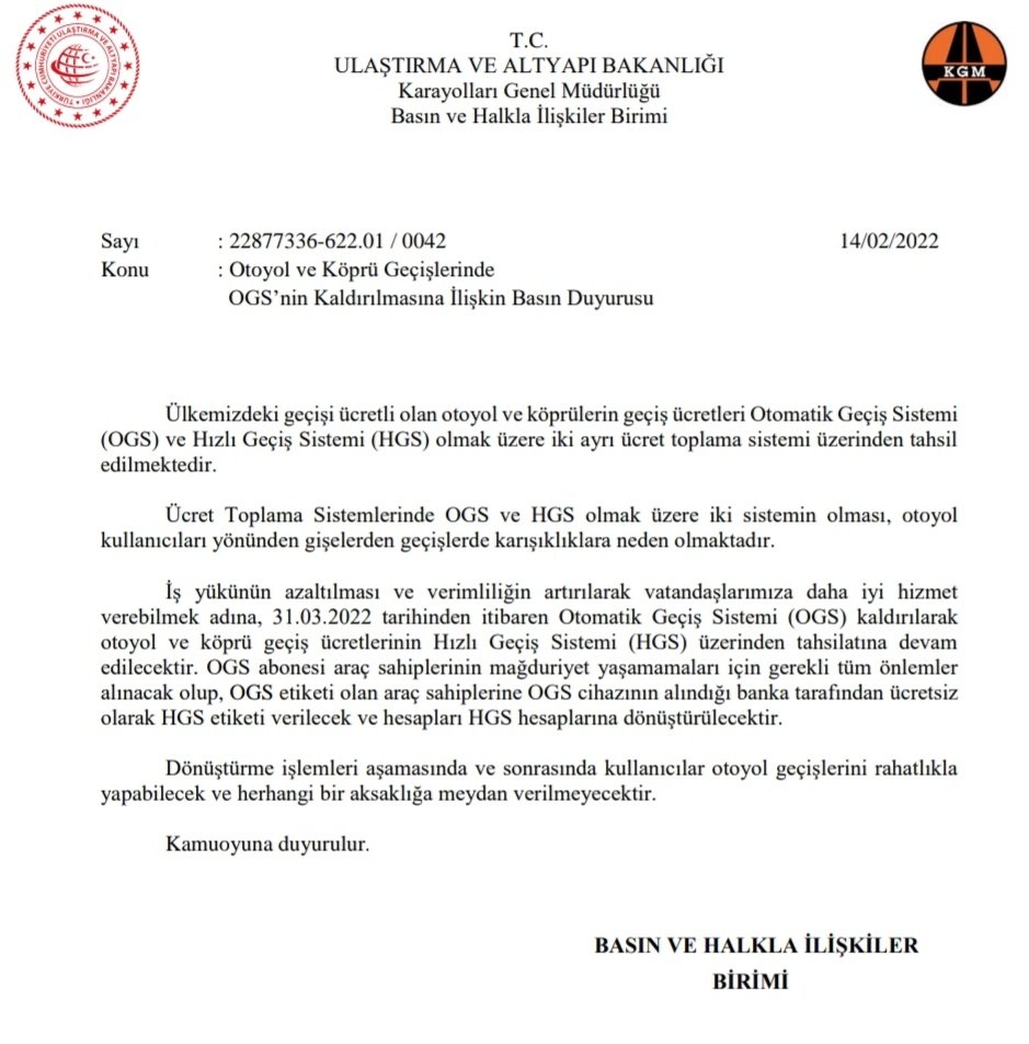 İş yükünün azaltılması ve verimliliğin artırılarak vatandaşlarımıza daha iyi hizmet verebilmek adına, 31.03.2022 tarihinden itibaren Otomatik Geçiş Sistemi (OGS) kaldırılarak otoyol ve köprü geçiş ücretlerinin Hızlı Geçiş Sistemi (HGS) üzerinden tahsilatına devam edilecektir.