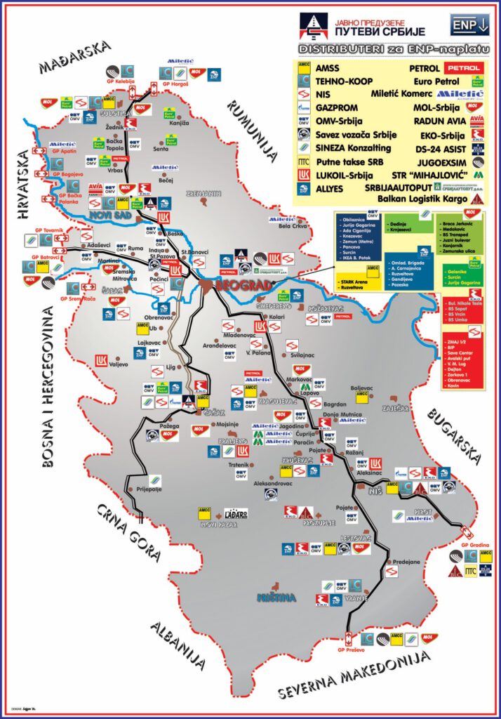 ENP cihazları PE “Roads of Serbia” tesislerinden, Sırbistan genelinde bulunan yetkili distribütörlerden ve hemen hemen bütün benzinliklerden satın alınabilir ve yükleme yapılabilir.