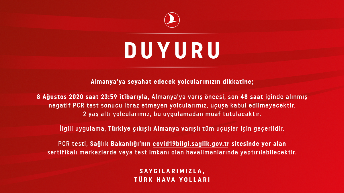 PCR testini yaptırmayan yolcuların uçuşa kabul edilmeyeceği hatırlatılan açıklamada, uygulamanın Türkiye çıkışlı Almanya varışlı tüm uçuşlar için geçerli olduğu belirtildi.