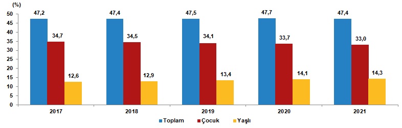 Çalışma çağındaki birey başına düşen çocuk ve yaşlı birey sayısını gösteren toplam yaş bağımlılık oranı, 2020 yılında yüzde 47,7 iken 2021 yılında yüzde 47,4’e düştü.