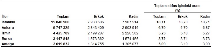 İstanbul’un nüfusu, bir önceki yıla göre 378 bin 448 kişi artarak 15 milyon 840 bin 900 kişi oldu. Türkiye nüfusunun yüzde 18,71’inin ikamet ettiği İstanbul’u, 5 milyon 747 bin 325 kişi ile Ankara, 4 milyon 425 bin 789 kişi ile İzmir, 3 milyon 147 bin 818 kişi ile Bursa ve 2 milyon 619 bin 832 kişi ile Antalya izledi.