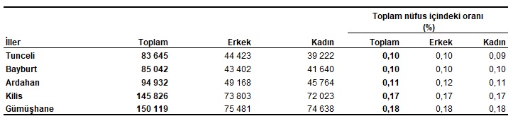 Tunceli, 83 bin 645 kişi ile en az nüfusa sahip olan il oldu. Tunceli’yi, 85 bin 42 kişi ile Bayburt, 94 bin 932 kişi ile Ardahan, 145 bin 826 kişi ile Kilis ve 150 bin 119 kişi ile Gümüşhane takip etti.