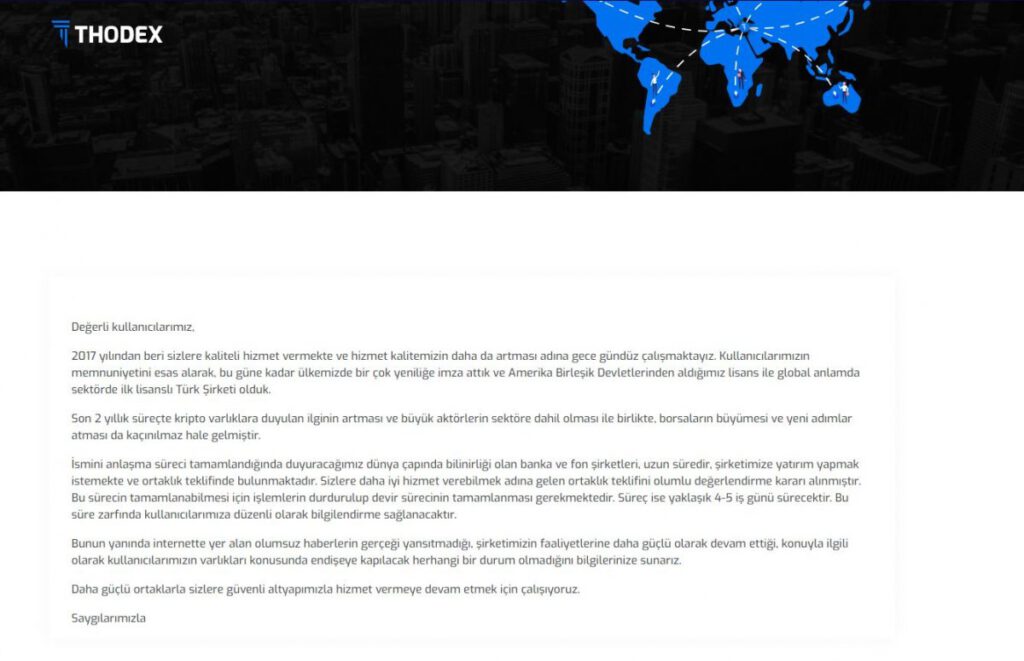 THODEX uyarı mesajında; yeni ortaklık teklifleri aldıklarını, bu teklifleri kabul ettiklerini ve anlaşma tamamlanana kadar tüm işlemlerin durdurulduğunu söylüyor.