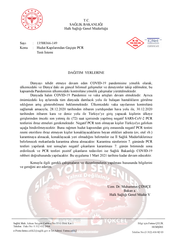 Bu kapsamda, Türkiye’ye korona virüsünün girişinin engellenmesi amacıyla; 28.12.2020 tarihinden itibaren yurtdışından hava yolu ile, 30.12.2020 tarihinden itibaren kara, hava ve deniz yolu ile Türkiye’ye giriş yapacak kişilerin ülkeye girişlerinden önceki son yetmiş iki (72) saat içerisinde yapılmış negatif korona PCR testlerini ibraz etmeleri gerekmektedir.