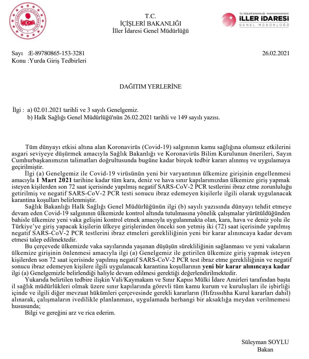 Covid19 virüsünün yeni bir varyantının ülkemize girişinin engellenmesi amacıyla 1 Mart 2021 tarihine kadar tüm kara, deniz ve hava sınır kapılarımızdan ülkemize giriş yapmak isteyen kişilerden son 72 saat içerisinde yapılmış negatif PCR testlerini ibraz etme zorunluluğu; Sağlık Bakanlığımızın aldığı tedbirler kapsamında ülkemizdeki vaka sayılarının kontrolünü sağlamak amacıyla yeni bir karar alınıncaya kadar devam edecektir.