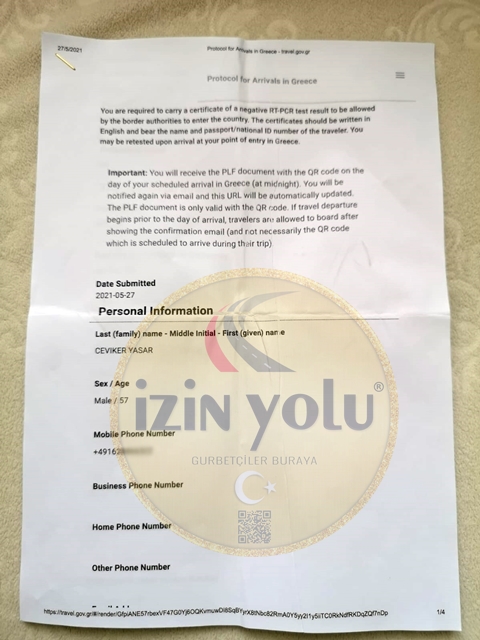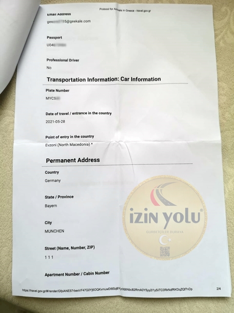 Yunanistan’a girişte Sınır Kapısında 10 Euro karşılığında sınırda ”Ülkeye Giriş Formu” doldurup, daha sonrasında Kipi/İpsala Sınır kapısından Türkiye İpsala Sınır kapısına sorunsuz şekilde geçiş yaptığını belirtti. Yunanistan ve Türkiye’ye girişte de kendisinden PCR testi istenilmediğini yaptığımız telefon görüşmesinde bize iletti.