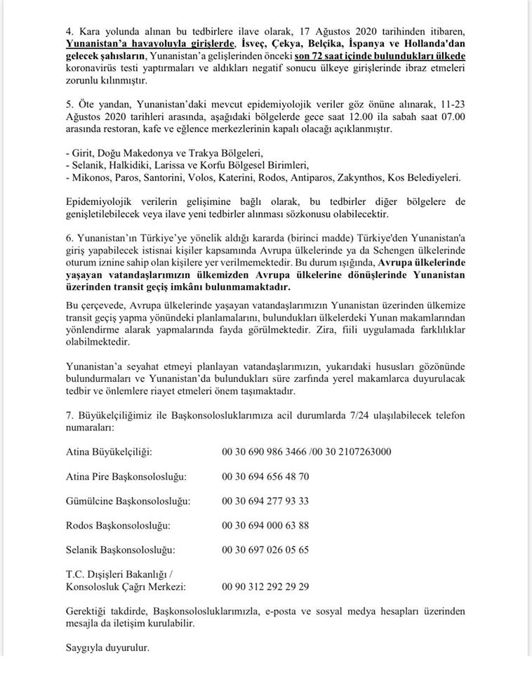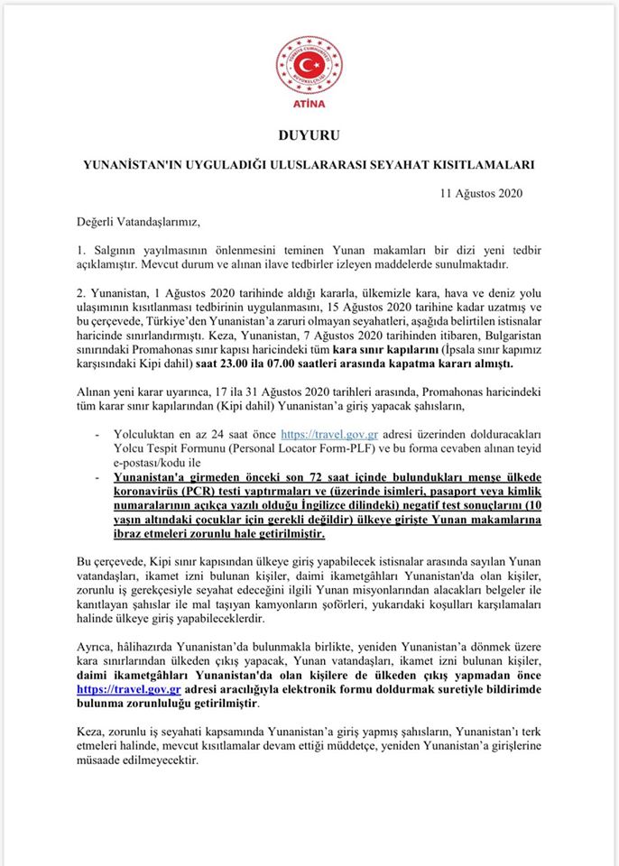 2. Yunanistan, 1 Ağustos 2020 tarihinde aldığı kararla, ülkemizle kara, hava ve deniz yolu ulaşımının kısıtlanması tedbirinin uygulanmasını, 15 Ağustos 2020 tarihine kadar uzatmış ve bu çerçevede, Türkiye’den Yunanistan’a zaruri olmayan seyahatleri, aşağıda belirtilen istisnalar haricinde sınırlandırmıştı. Keza, Yunanistan, 7 Ağustos 2020 tarihinden itibaren, Bulgaristan sınırındaki Promahonas sınır kapısı haricindeki tüm kara sınır kapılarını (İpsala sınır kapımız karşısındaki Kipi dahil) saat 23.00 ila 07.00 saatleri arasında kapatma kararı almıştı.