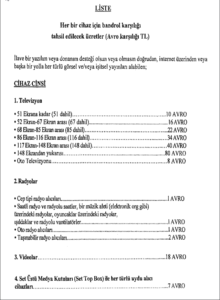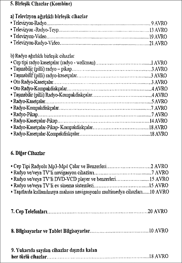 Televizyon ağırlıklı birleşik cihazlar için 9-21 Euro, radyo ağırlıklı birleşik cihazlar için 1-18 Euro ücret tahsil edilecek. Bunların dışında kalan her türlü cihaz için de 18 Euro bandrol ücreti belirlendi. Ücretler, Euro karşılığı Türk lirası olarak alınacak.