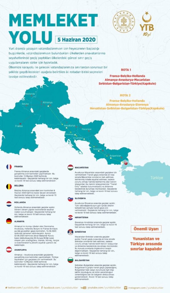 Yurt dışında yaşayan vatandaşlarımızın izin heyecanının başladığı bugünlerde, vatandaşlarımızın bulundukları ülkelerden anavatanlarına seyahatlerinde transit geçiş yaptıkları ülkelerdeki güncel sınır geçiş uygulamalarının paylaşılmasının faydalı olacağı değerlendirilmiştir.