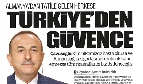 Türkiye’de tatilini geçirecek olanların hastalanmaları halinde tedavi masraflarının karşılanacağı güvencesini veren Çavuşoğlu, “Eğer burada bir tatilci ağır hastalanırsa ve Alman sağlık sigortası masrafları karşılamazsa Türkiye tüm tedavi giderlerini üstlenecektir” diye konuştu.