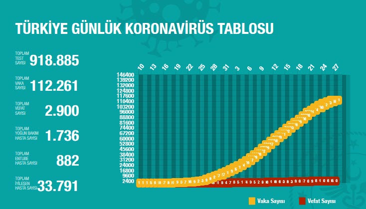 Sağlık Bakanı Fahrettin Koca, 27 Nisan günü itibari ile son 24 saatte gerçekleşen koronavirüsle ilgili ölüm ve toplam vaka sayısını açıkladı. Bakan Koca, verileri Sağlık Bakanlığı Korona Tablosunun görseliyle duyurdu.