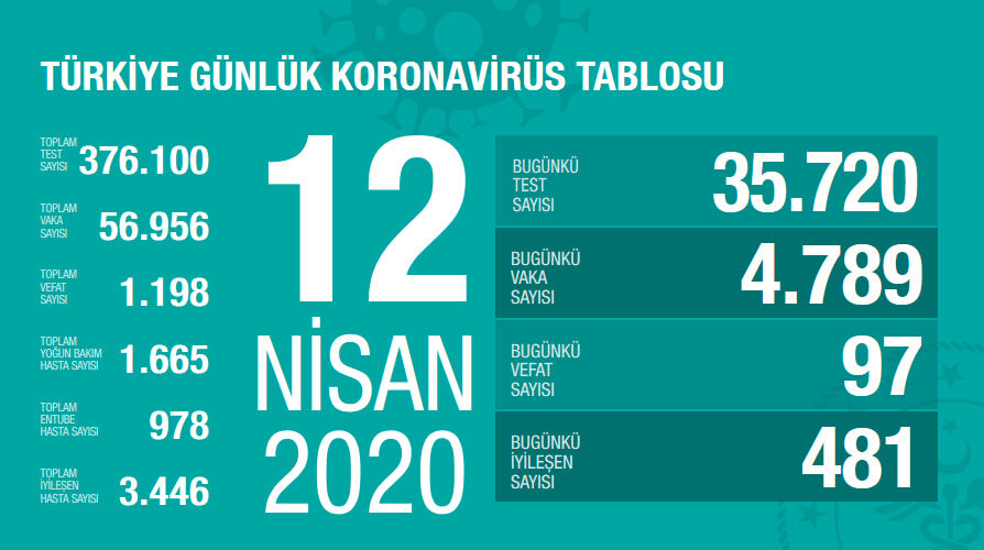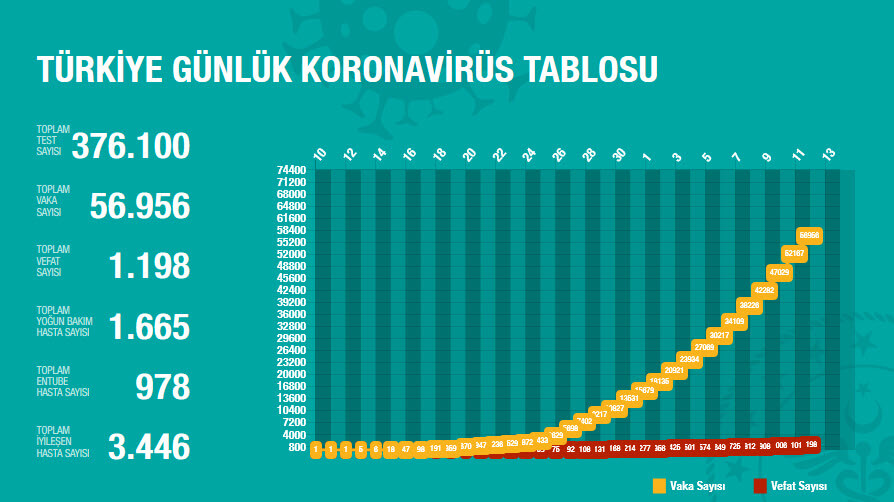 Son 24 saatteki test sayısı 35.720. Toplam yapılan test sayısı bu artışla 376.100 oldu. Yapılan testler sonucu korona virüs testleri pozitif çıkan vaka sayısı 4.789. Bu yükselişle toplam vaka sayısı 56.956’ya yükseldi.